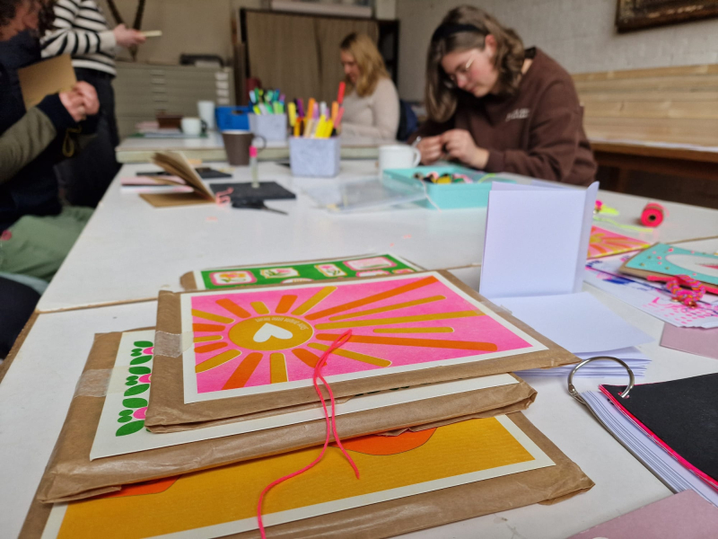 Im wunderbar vorbereiteten Buchbinde- und Handlettering-Workshop mit der Kunstpädagogin Sabine Lachenmayr durften wir uns im Fritz Koenig Atelier frei spielen. Sabine gab uns verschiedene Techniken an die Hand, und bald hatte jede*r von uns ein selbst gestaltetes Büchlein. Im Laufe des Tages, sollten wir es auch befüllen. Es wurde konzentriert gearbeitet, ausprobiert und gegenseitig inspiriert.
